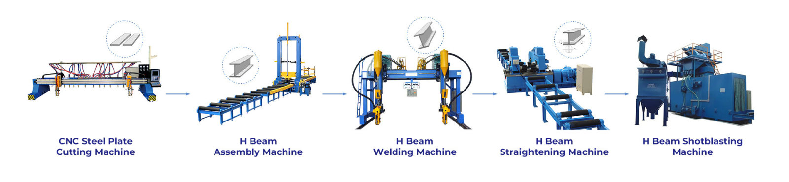 H-beam production line is a combined work-station specialized for the process of H-beam production. This series integrates the function of cutting, assembling, welding and straightening by using CNC Cuting Machine, H-Beam Assembly Machine, H-Beam flange straightening Machine and H-Beam Welding Machine.